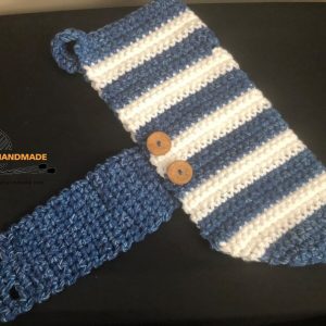 The sweater is easy to get on and off as the neck opening slips right over the pup’s head. The strap on the bottom fastens easily with two buttons slipping easily into the crocheted buttonholes. (There are two sets of buttonholes to allow for a more customize strap fit).